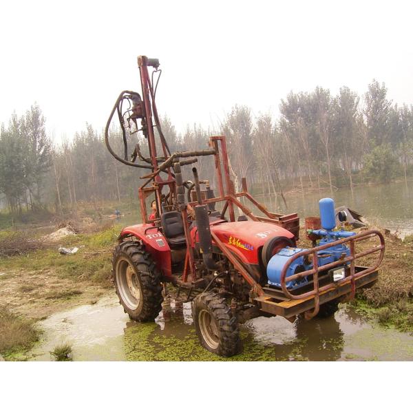 Tractor drilling rig was a kind of new type that designed for petroleum prospecting in Hill, Gobi and Jungle area. The drill was mounted on 4X4 tractor which has high quality and large power. The power of drilling rig was take off from the tractor engine. Adopted advanced hydraulic technology to control the rotation, pulldown, hoisting, jack flex movement. The operation is easy and reliable, the movement is flexible and the transport is convenient. Meet QHSE requirement in international prospecting marketing. The Standard configured drilling rig has auger drilling function, after equipped with mud pump or air compressor according to client’s demand, the drilling rig can carry out mud drilling or downhole hammer drilling, it can be used to drill in complex stratum area like rock, clay, rivers network, and so on.